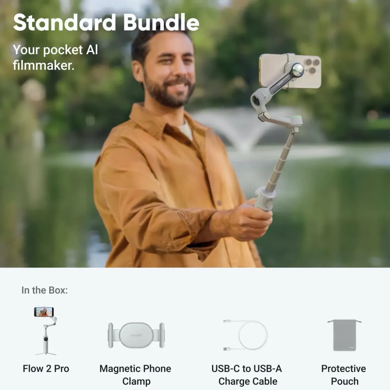 - In the Box | 1x Insta360 Flow 2 Pro | 1x Magnetic Phone Clamp | 1x USB-C to USB-A Charge Cable | 1x Protective Pouch